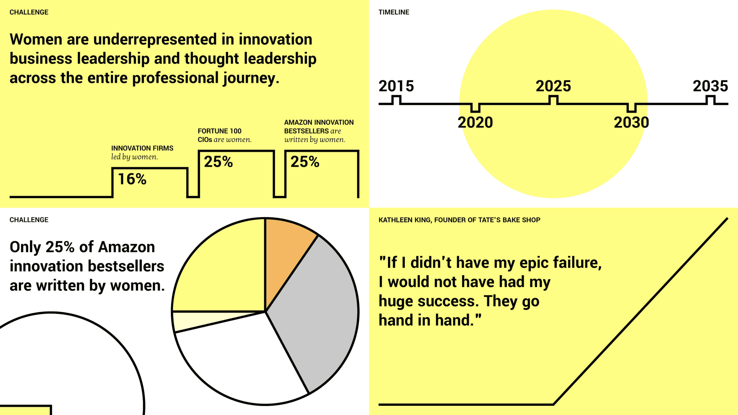 Our new brand illuminates the work of innovative women. Our fonts are designed by women: Ania Kruk and Erin McLaughlin. Our yellow color palette is symbolic of the early suffrage movement (and is also a nod to an innovator’s weapon of choice: the post-it).