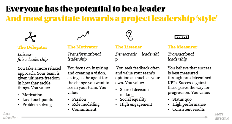 As you step into a leading role, this offers an opportunity to start defining what leader you aspire to be (or don’t want to be). Our personal experience with project leaders can serve as insightful inspiration on values, qualities and behaviour that we can learn from and incorporate in our style moving forward.